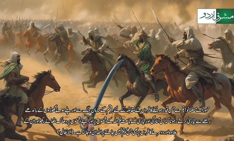 ”اور اے مسلمانو! تم سے جس قدر ہو سکے کافروں کے مقابلہ کے لئے ہر قسم کے سامان جنگ سے اور پلے ہوئے گھوڑوں کے باندھے رکھنے سے تیاری کرتے رہو تا کہ اس آمادگی اور تیاری کے باعث تم اللہ کے دشمنوں پر اور اپنے دشمنوں پر دھاک بٹھائے رکھو اور ان کے علاوہ اور دوسرے کافروں پر بھی جن کوتم نہیں جانتے پر اللہ ان کو جانتا ہے”۔ (الانفال)